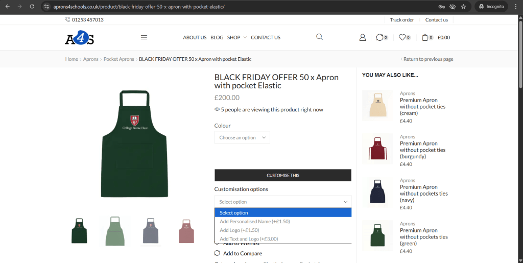 - Simplified product browsing with clear categories for aprons, lab coats, tabards and personalised options